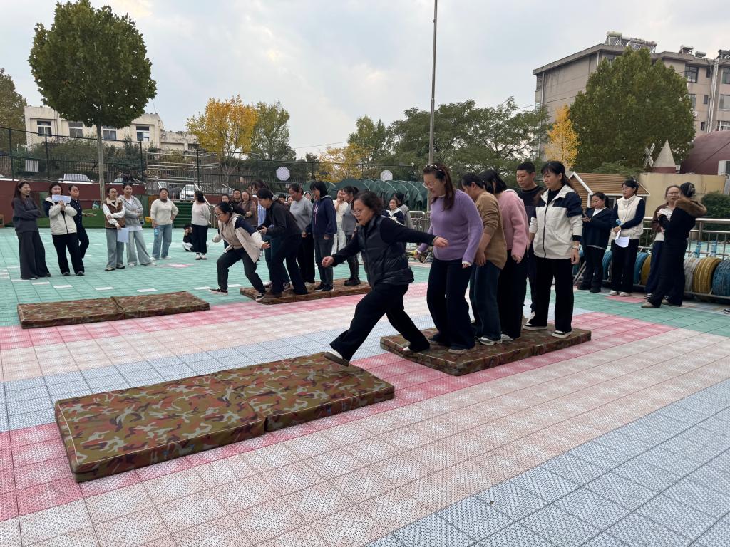 随后,丰富多彩的团队建设活动依次展开。活动设计巧妙,将红色精神与团队协作融入其中。在“薪火相传”个人竞技中,教职工们用双腿夹球跳跃前行。这不仅是对个人平衡与毅力的考验,更象征着革命精神代代相传、永不停歇。