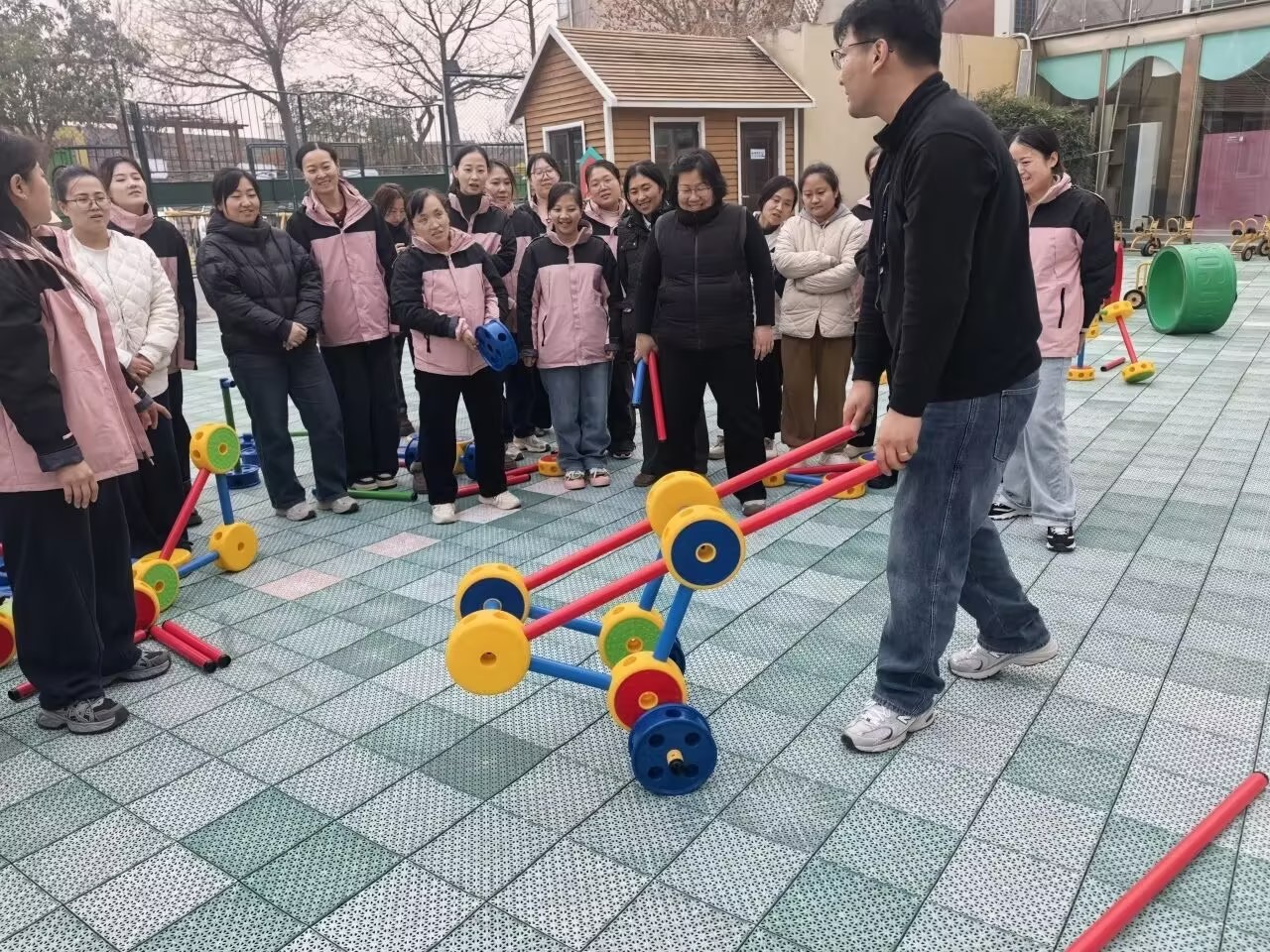 游戏是幼儿探索世界的钥匙,运动是儿童成长的基石。为落实“以游戏为基本活动”的教育原则,淄师附幼引进“万能工匠”游戏材料,并特邀专业培训师房老师开展沉浸式专题培训。培训以“理论+实践”双轨并行,围绕“材料认知—场景应用—科学收纳—游戏设计”四大模块展开,助力教师掌握材料运用精髓,让其成为激发幼儿创造力、锻炼体能、促进协作的有效载体。