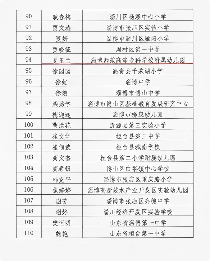 近日,淄博市教育局正式发布《关于公布淄博市名师名校长名班主任(2023-2025)人员名单的通知》,我园教师夏玉兰凭借深厚的专业素养、卓越的育人成效与突出的教研贡献,被认定为淄博名师。这份荣誉的取得,既是对教师个人深耕幼教一线、潜心立德树人的高度认可,也是我园推进教师队伍专业发展、助力淄博学前教育质量提升的生动成果。